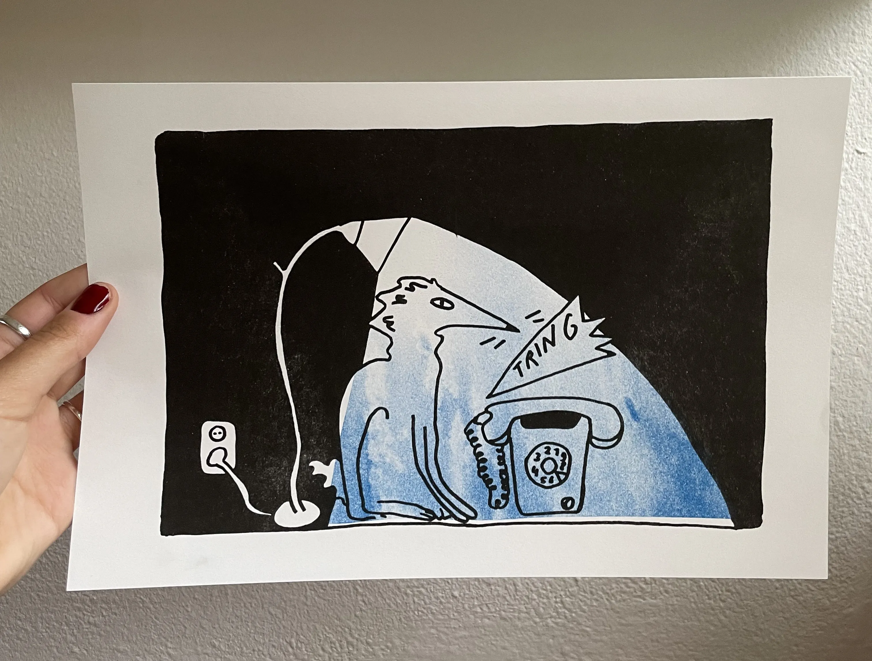 One of my first programming projects was creating this animal-like creature. It was made in Processing, a Java-based language designed for visual arts and interactive media. I built the creature entirely out of geometric shapes and lines, drawing inspiration from a riso-printed drawing I had made earlier.