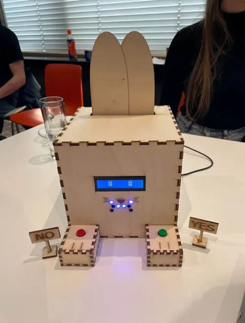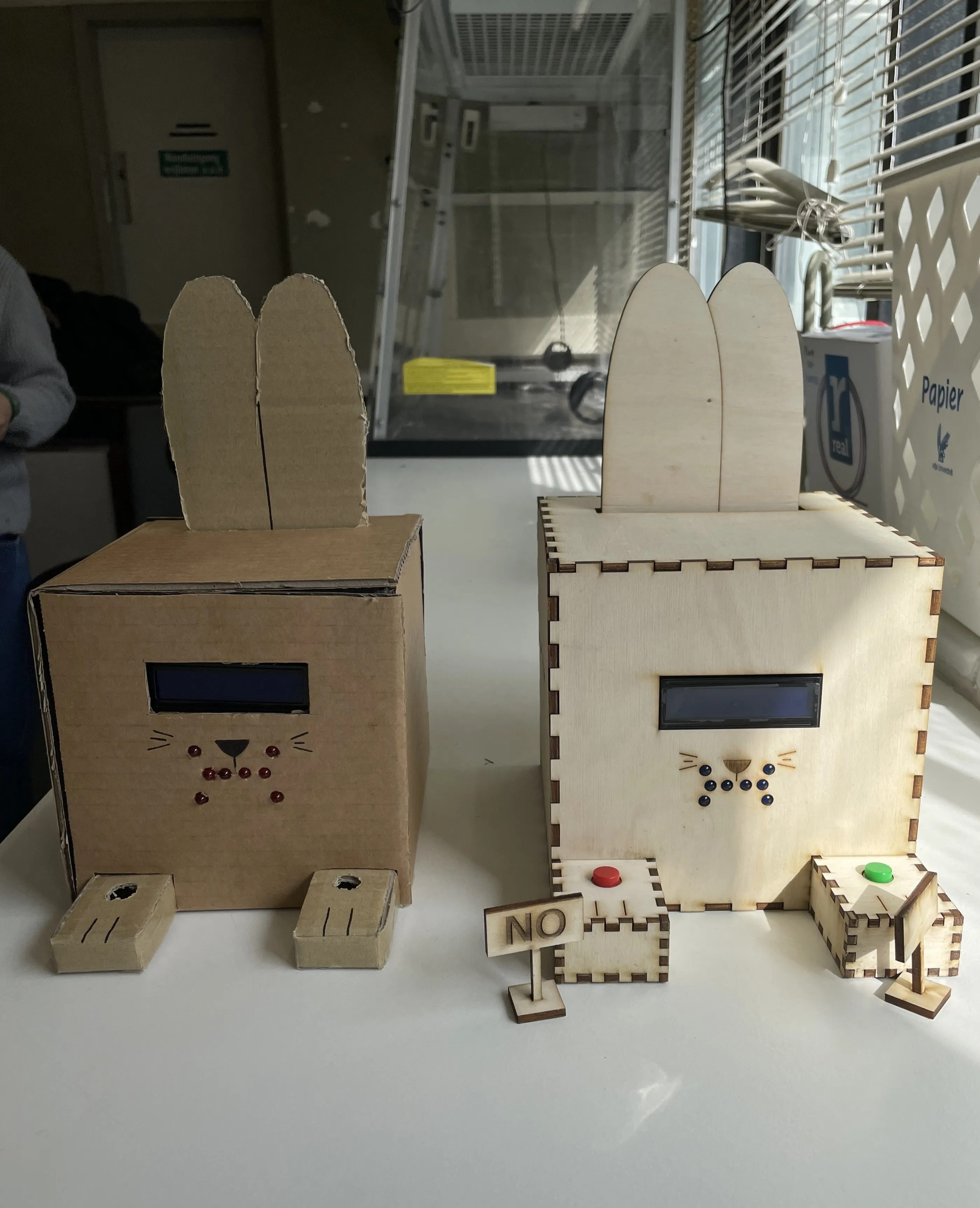 The exterior of the bunny is cut and engraved with a laser cutter out of plywood. The bunny runs on an Arduino Leonardo. We used a servo motor to move the bunny’s ears, an LCD screen for the eyes and LED lights for the bunny’s mouth. The code was written using Arduino software.