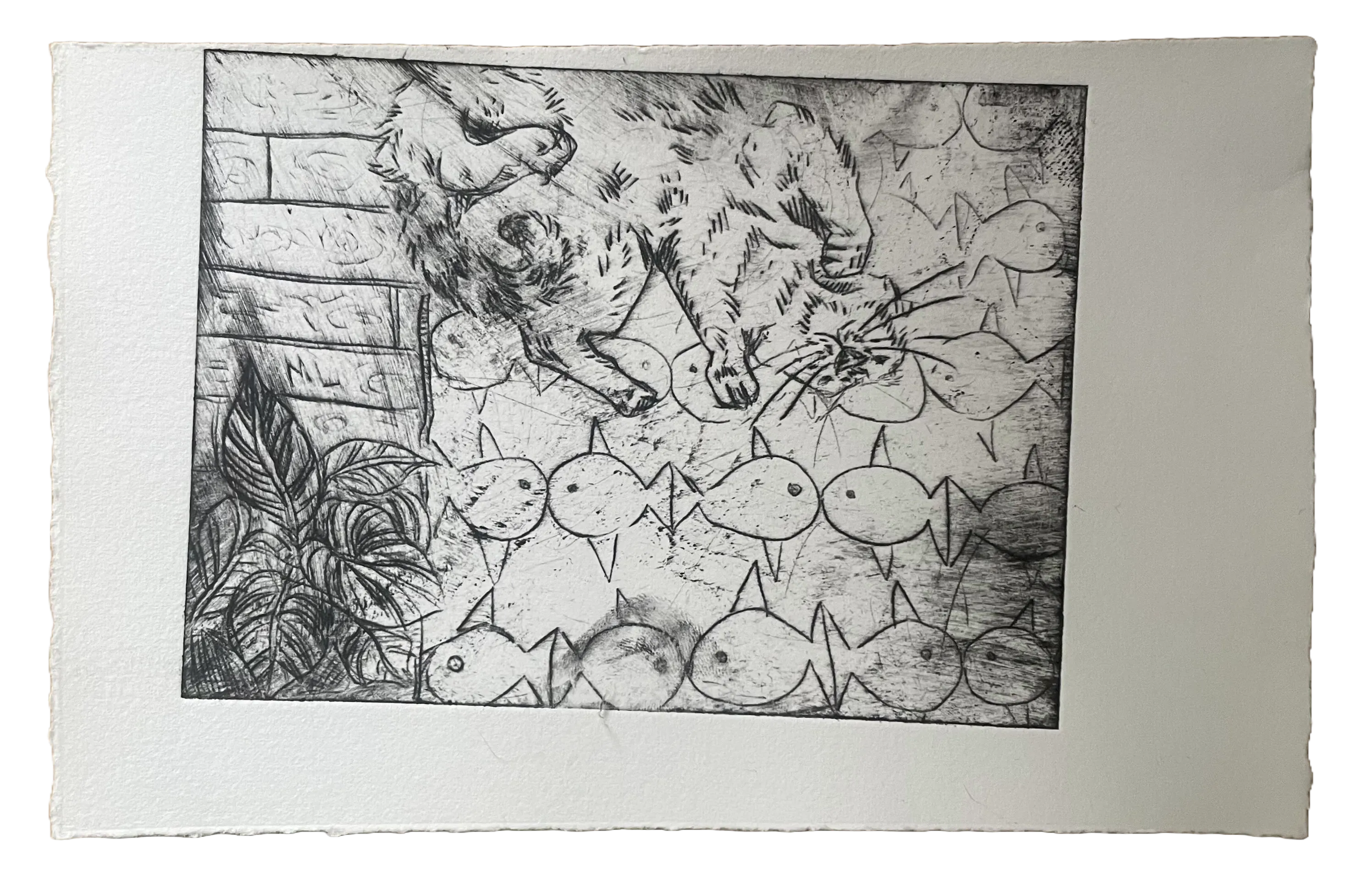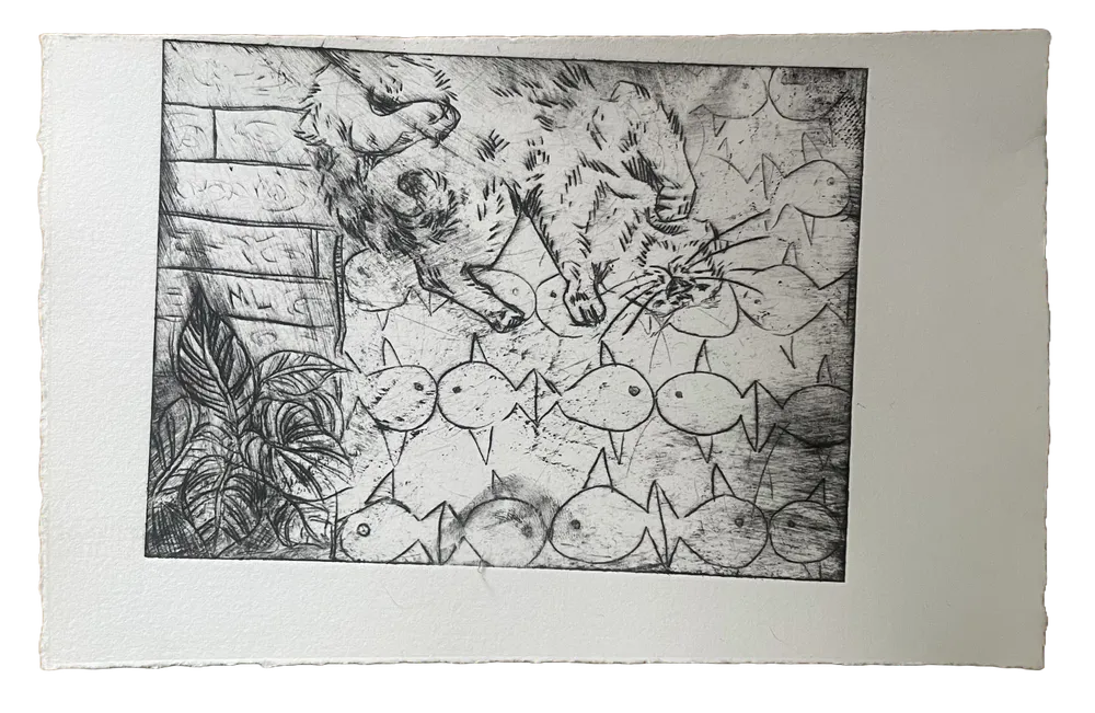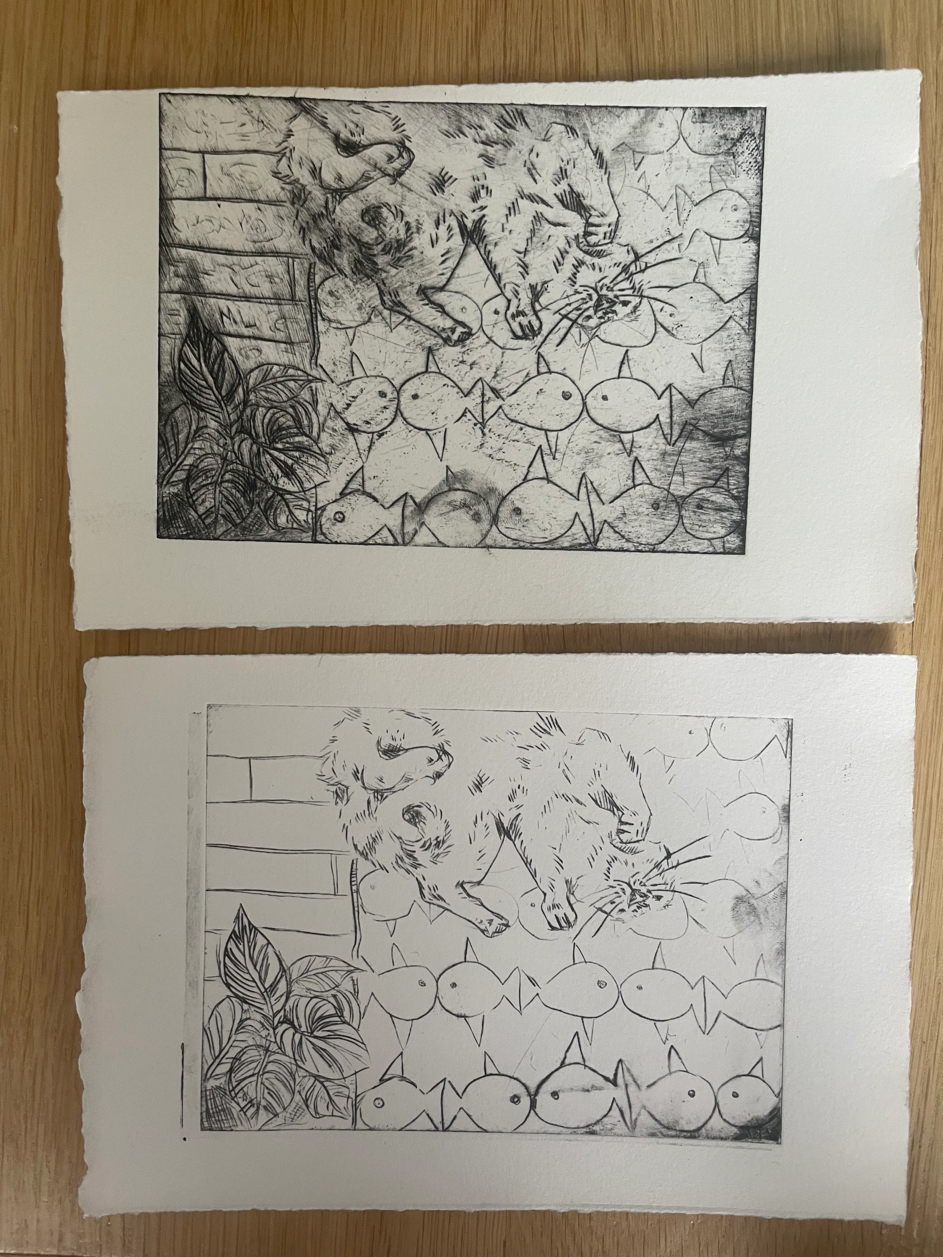 Etching is a traditional technique that uses copper to make prints. It involves many steps, including filing and sanding the copper plate, engraving the design with a needle, treating it with chemicals, inking the plate and finally running it through a printing press. I really like how much care goes into each print, and how every print turns out differently. These are some prints in which I experimented and practised with etching.
