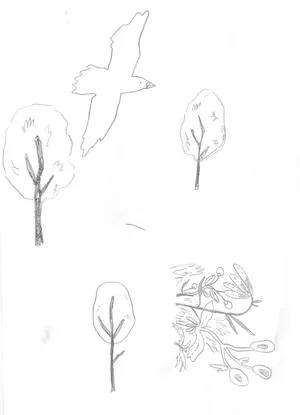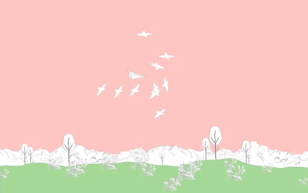The paper plane flies through a landscape featuring a looping background, along with randomly placed and sized trees and flowers. A flock of birds flies around the paper plane and follows it. To create a relaxing experience for players, I chose a minimal design with soft pastel colors. I drew all the images by hand and then scanned them digitally to create the game's visuals.