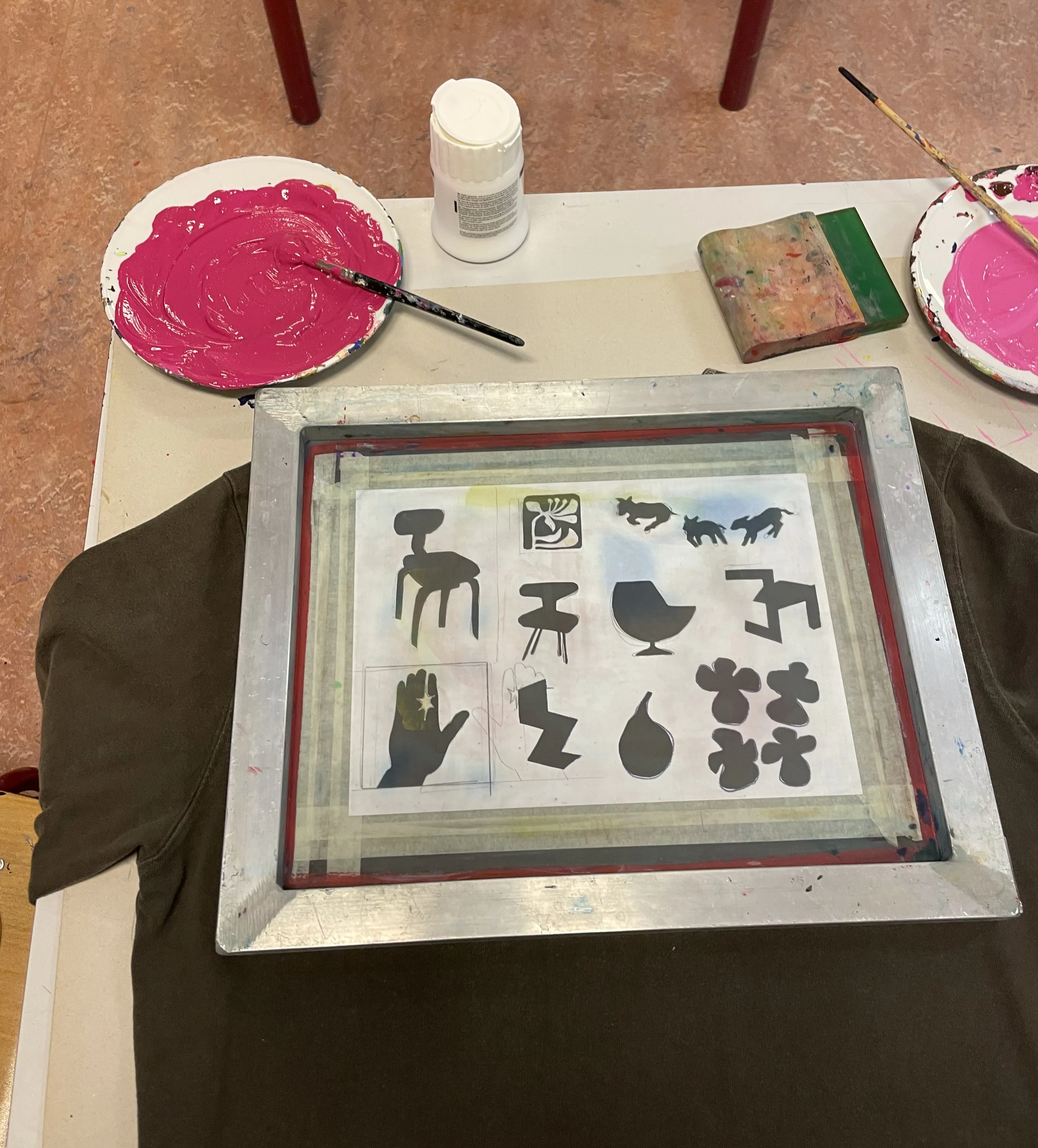 Screen printing is a technique in which ink is pressed through a screen onto a surface. With each layer, you can add a new color to the final print. I experimented with this process by cutting out templates and taping them onto a screen to print design on paper and textiles. For one piece, I used a picture I took of a river as inspiration, turning it into an abstract three-color print.